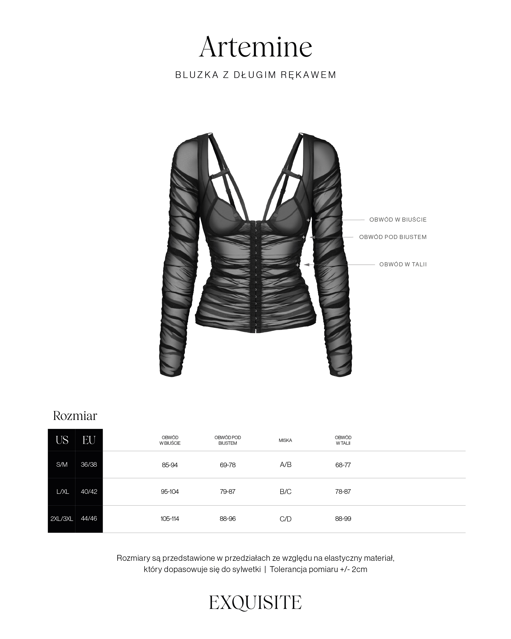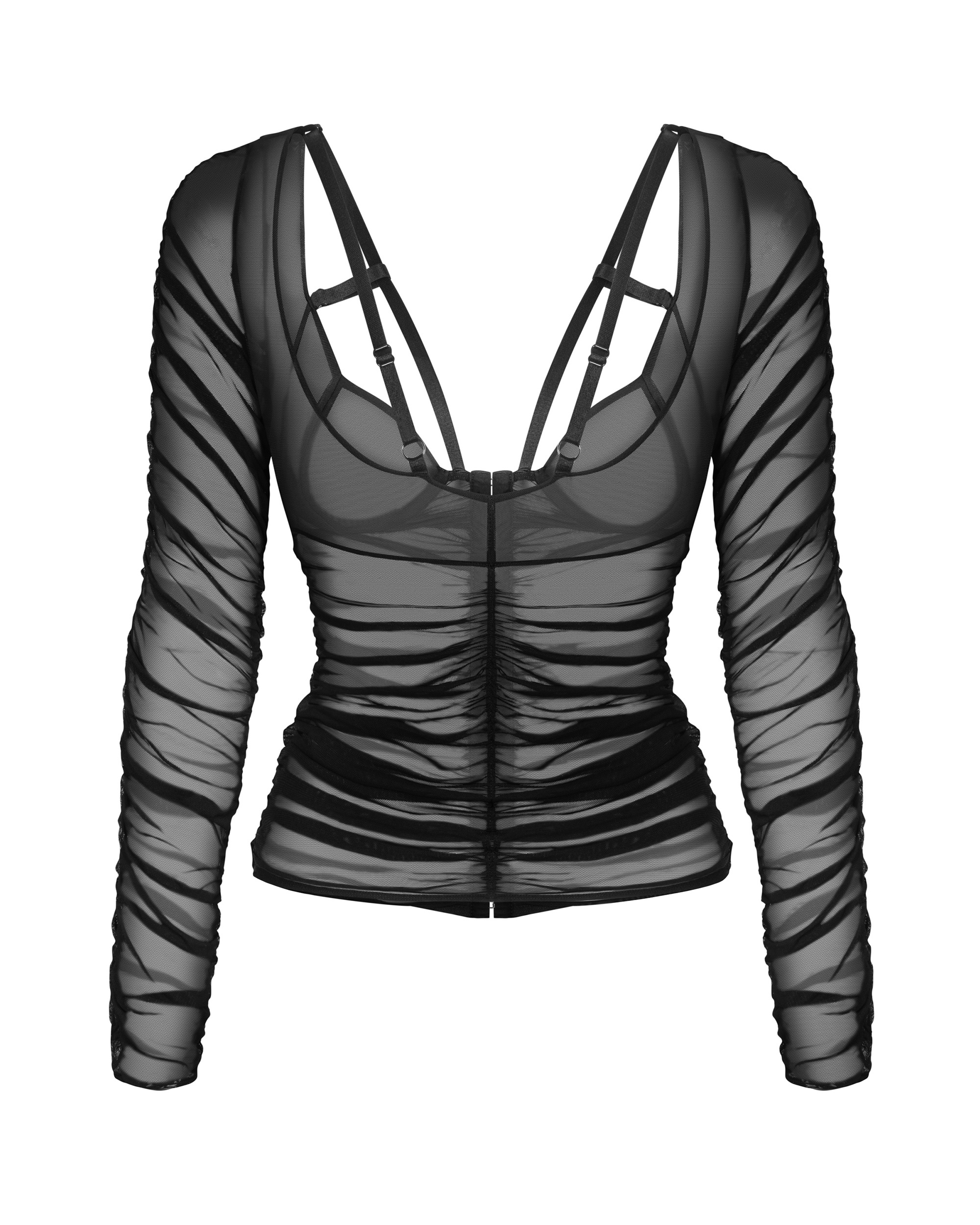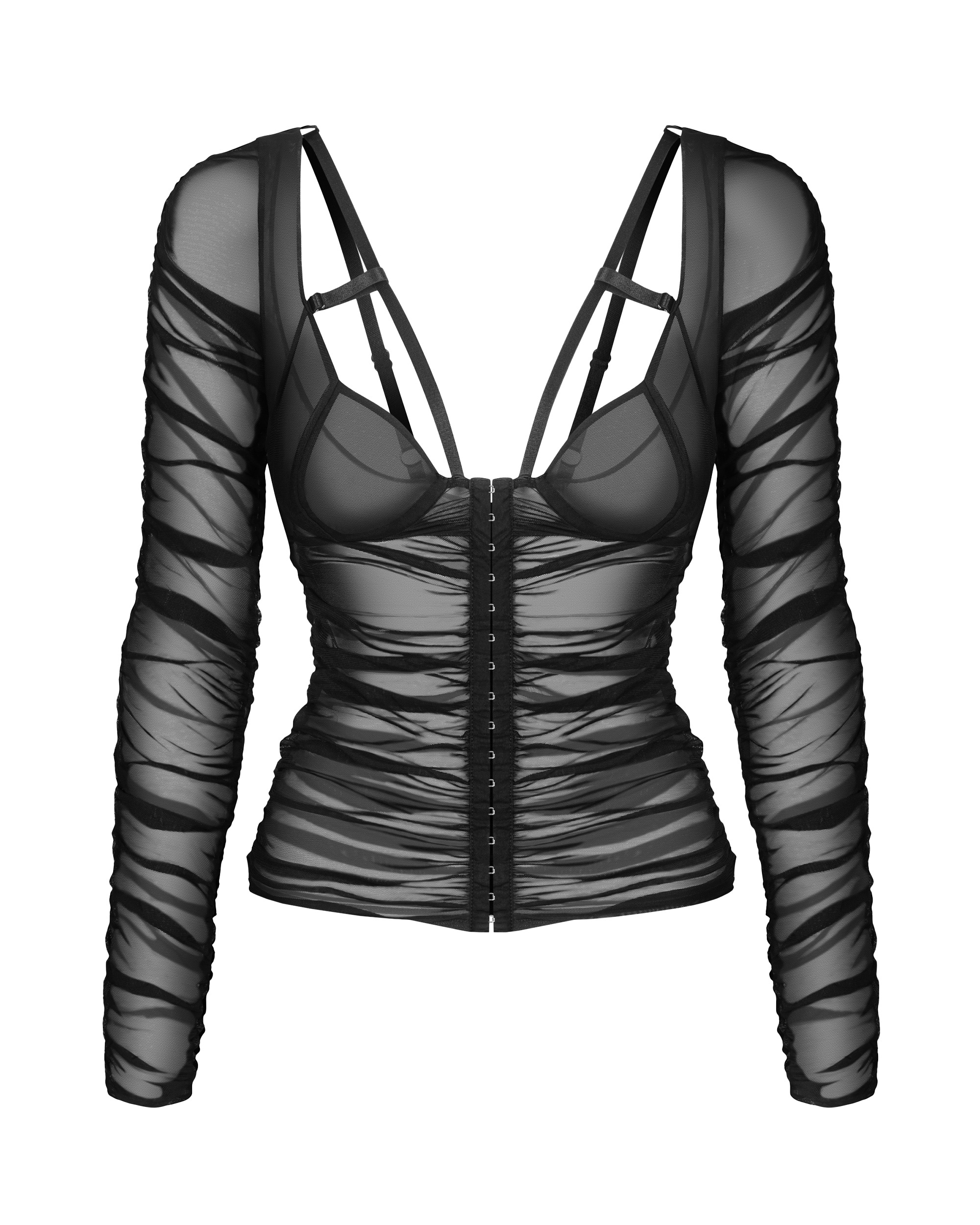 Czarny longsleeve Artemine z okrągłą miską i fiszbinami. Uszyty z transparentnego meshu premium. Posiada charakterystyczne paski nad biustem oraz ozdobne marszczenia. Dopasowanie do sylwetki zapewniają regulowane ramiączka oraz gorsetowe zapięcie z przodu.