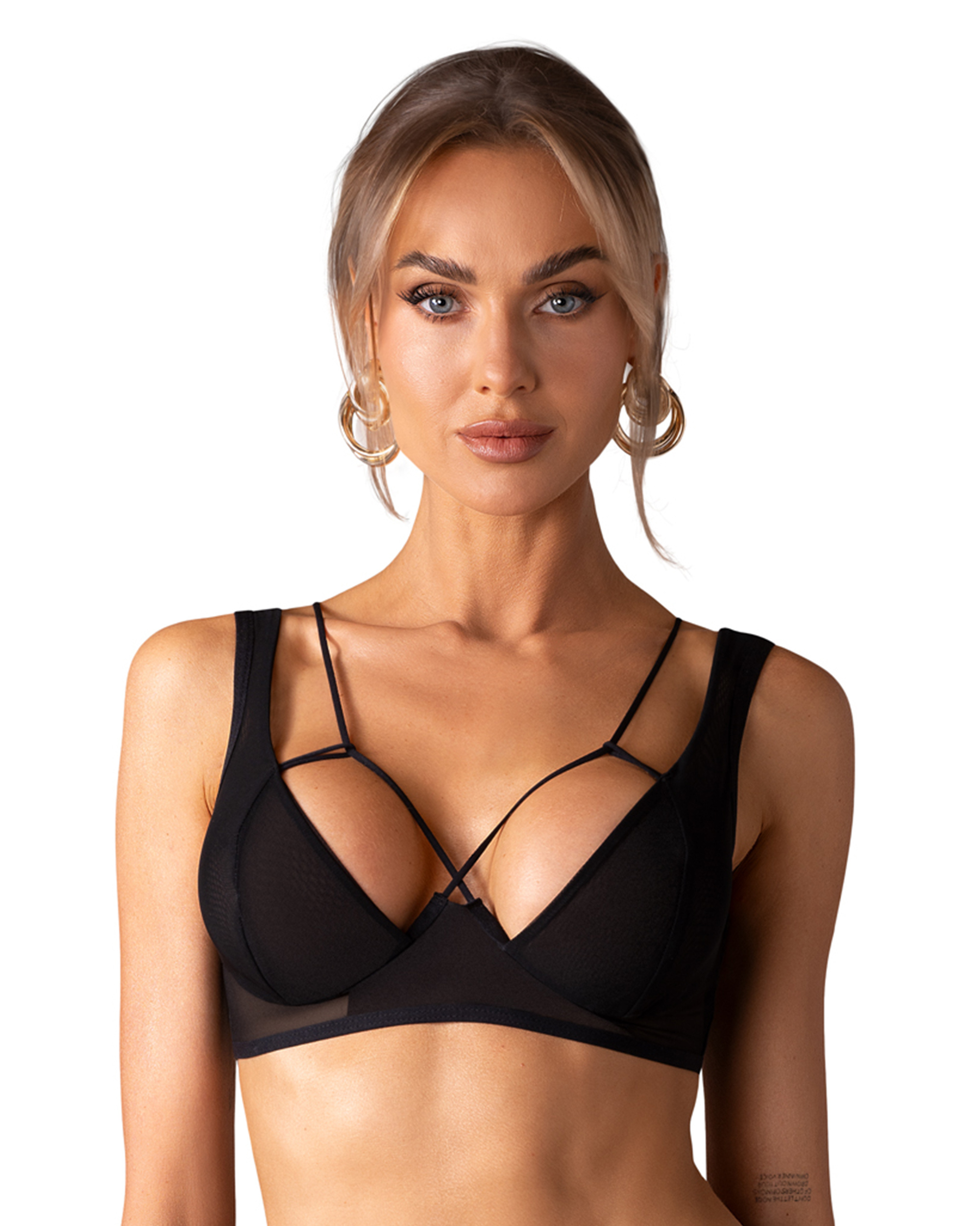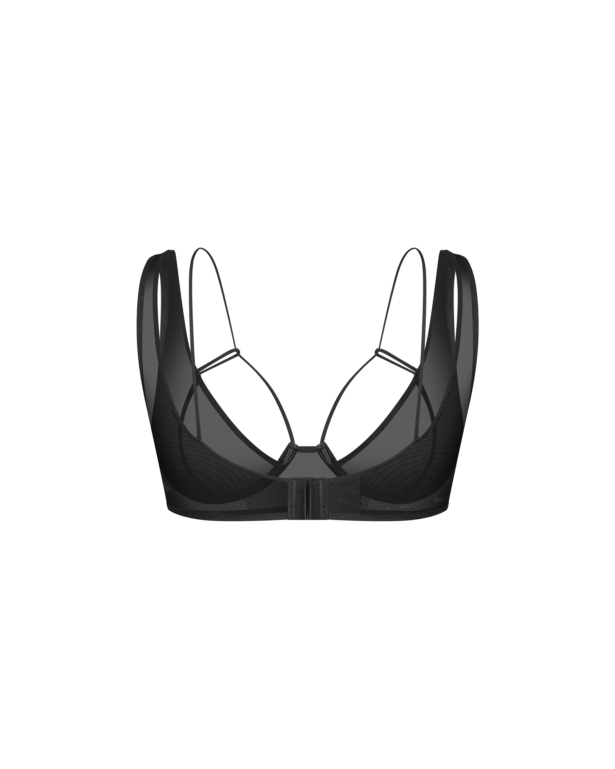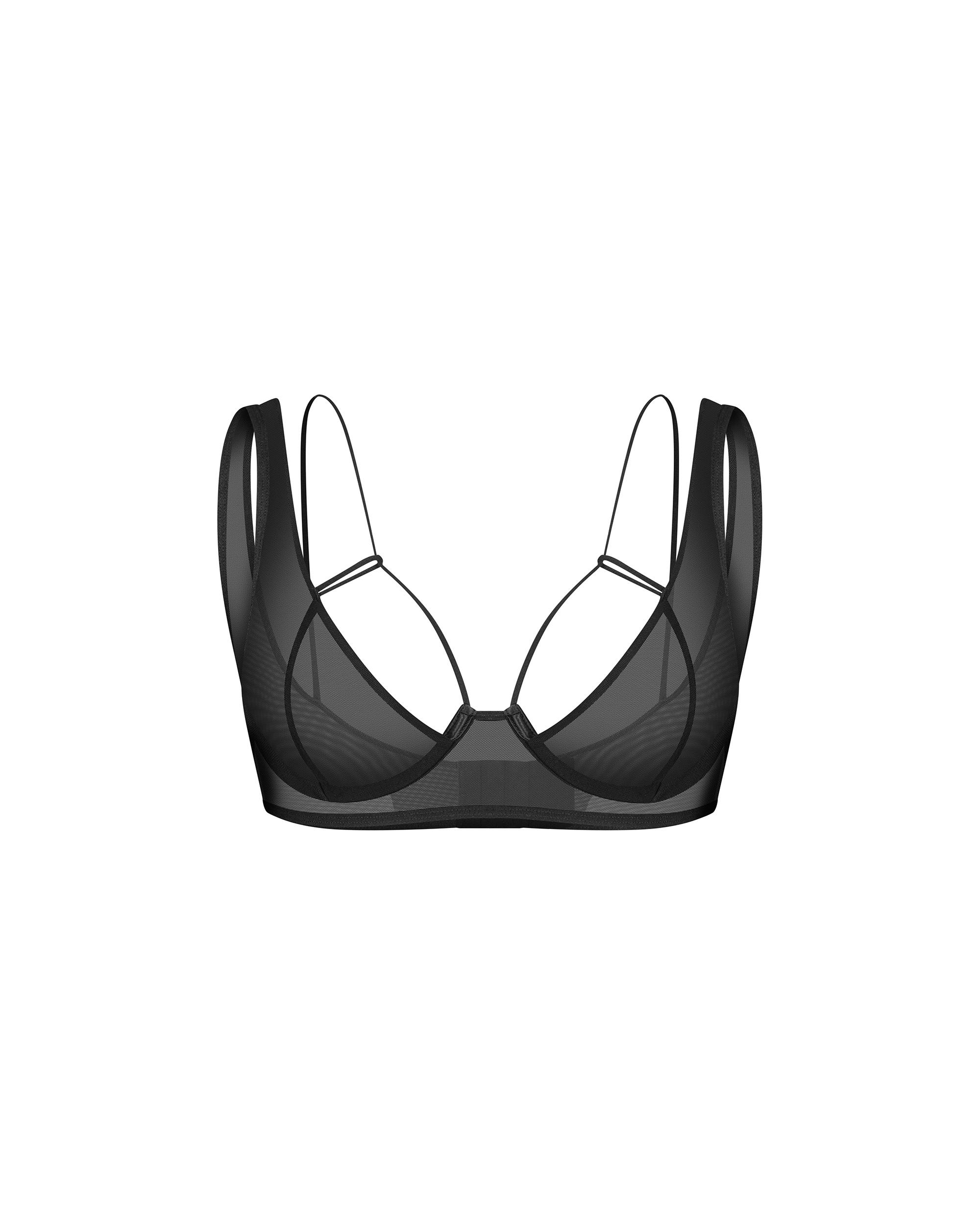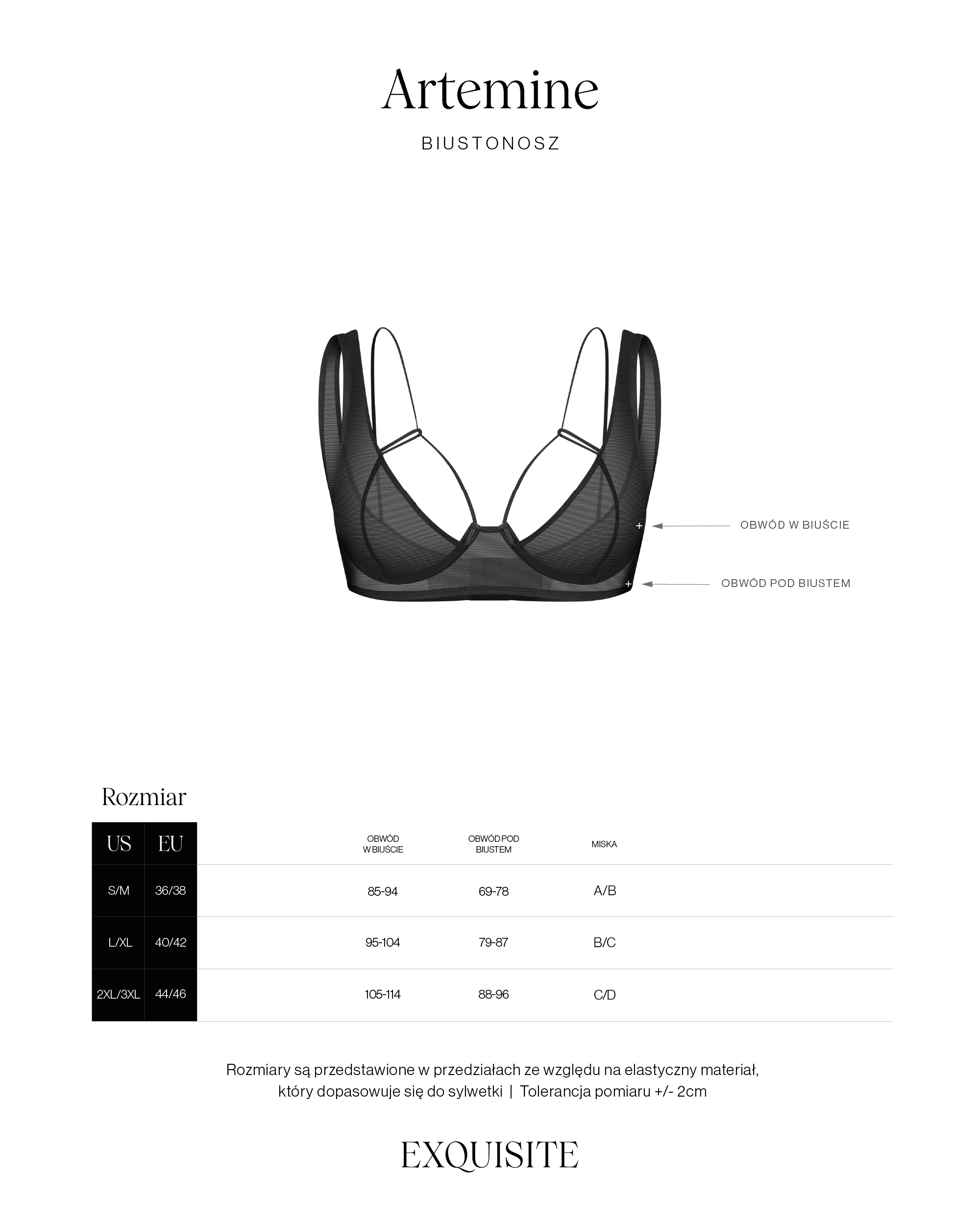 Czarna balkonetka z okrągłą miską i fiszbinami. Wykonana z podwójnego, luksusowego meshu. O wygodę dbają szerokie ramiączka oraz kilkustopniowe zapięcie na haftki z tyłu. Bieliznę ozdabiają czarne paski na dekolcie.