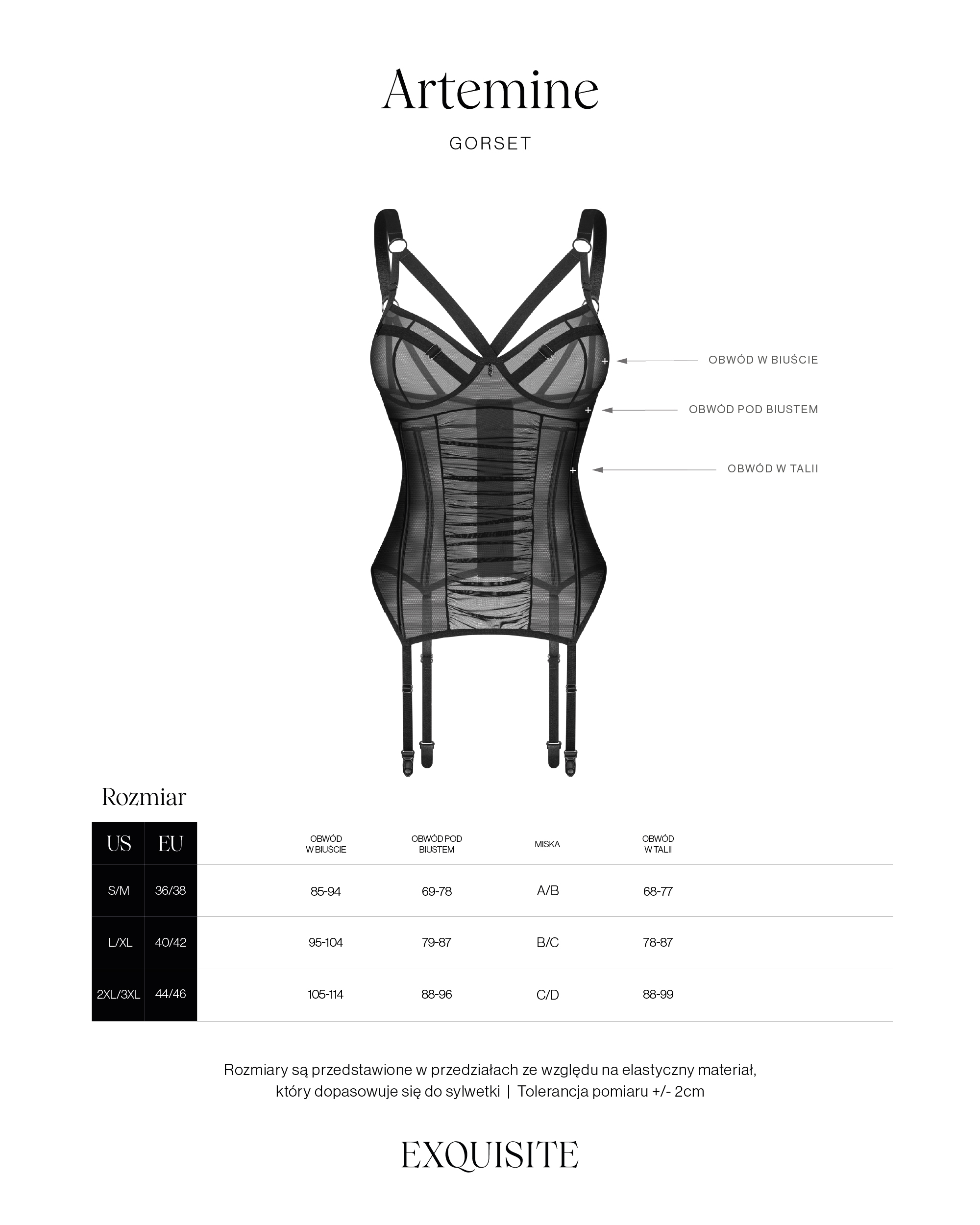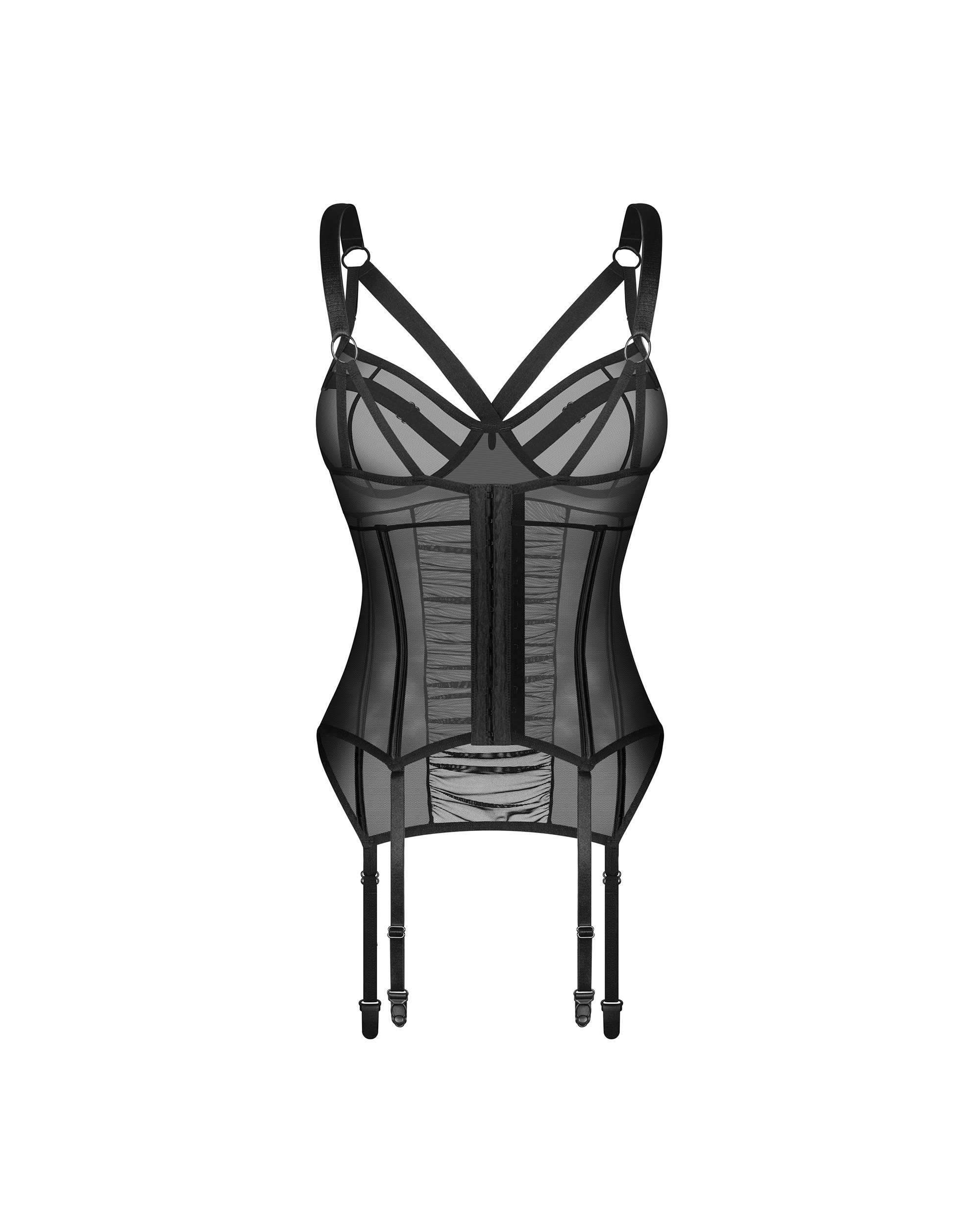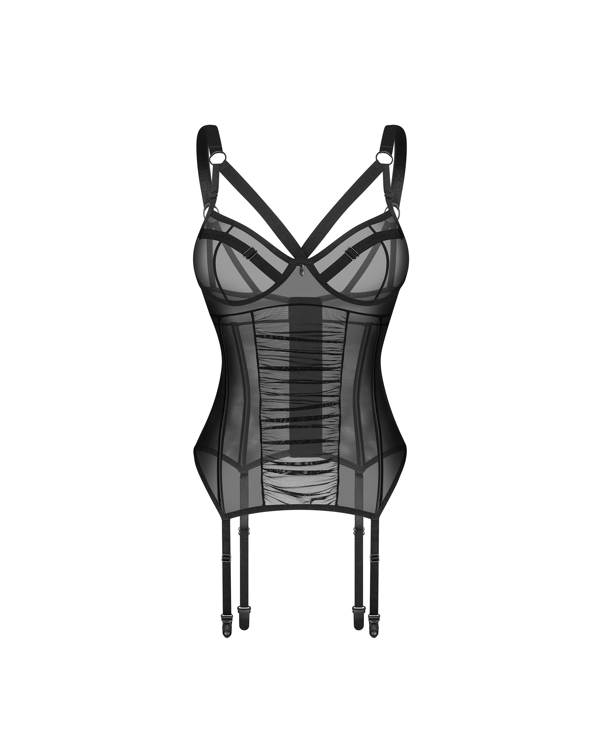 Gorset Artemine z biustonoszem na fiszbinach. Uszyty z transparentnego meshu z charakterystycznym marszczeniem z przodu. Szerokie, regulowane ramiączka i paski do pończoch, zapięcie na haftki z tyłu oraz pionowe fiszbiny dbają o dopasowanie do sylwetki.