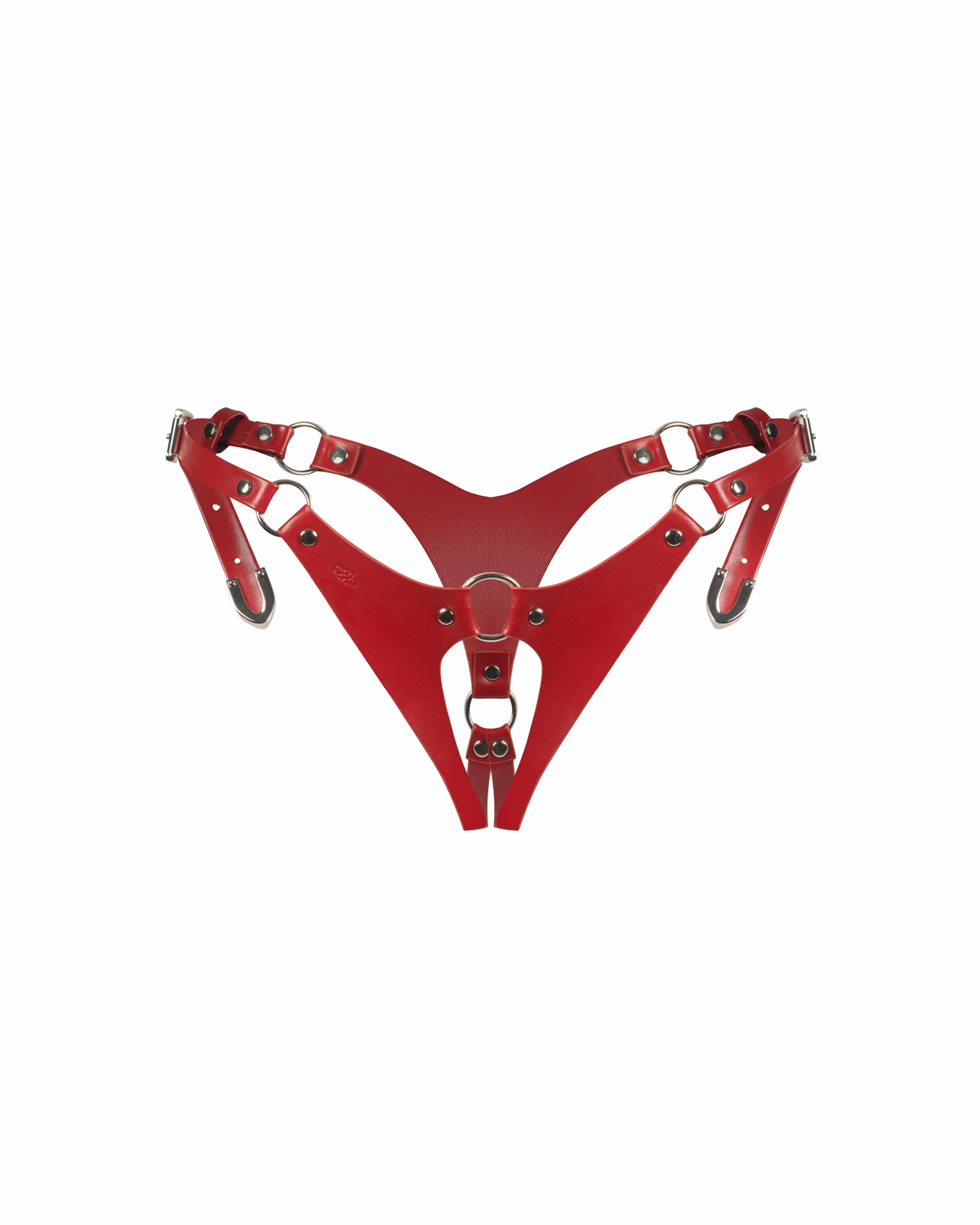 Minimalizm i odwaga w wydaniu premium. Otwarte stringi Inferro to bielizna, która podkreśla atuty sylwetki i eksponuje to, co najbardziej zmysłowe. Konstrukcja z czerwonych pasów i srebrnych kółek układa się niczym erotyczna biżuteria, prowadząc spojrzenie tam, gdzie chcesz. Idealne do odważnych stylizacji – w zestawieniu z uprzężami z tej samej kolekcji.