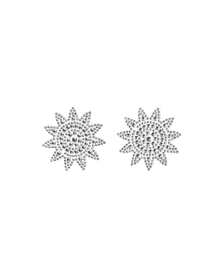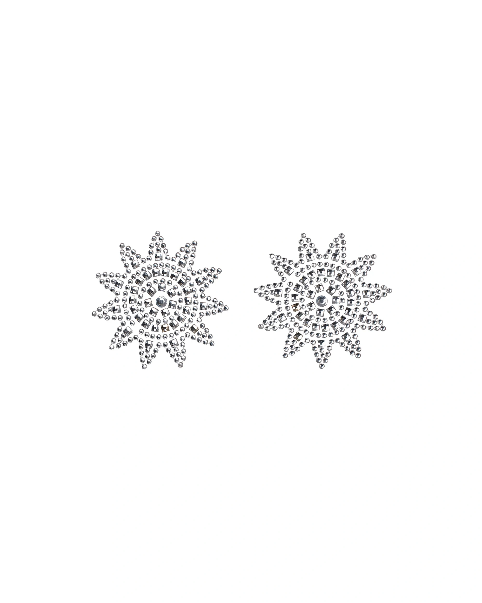 Ozdobne naklejki na sutki w kształcie promienistej gwiazdy, wykonane z drobnych akrylowych kryształków. Idealne jako element stylizacji typu cupless lub jako zmysłowy akcent na specjalne okazje. Hipnotyzujący połysk pobudza fantazję w najbardziej powabnym stylu. Dodatek, po który sięgasz wtedy, gdy potrzebujesz odrobiny zalotnego błysku bez zbędnych słów…