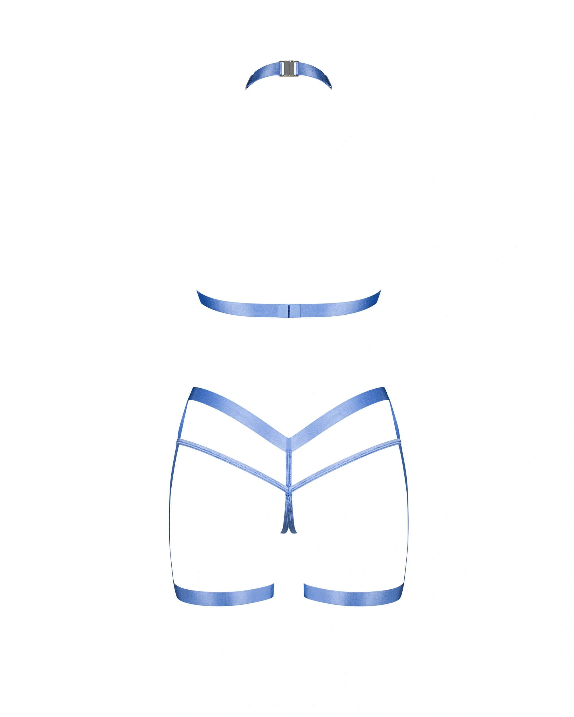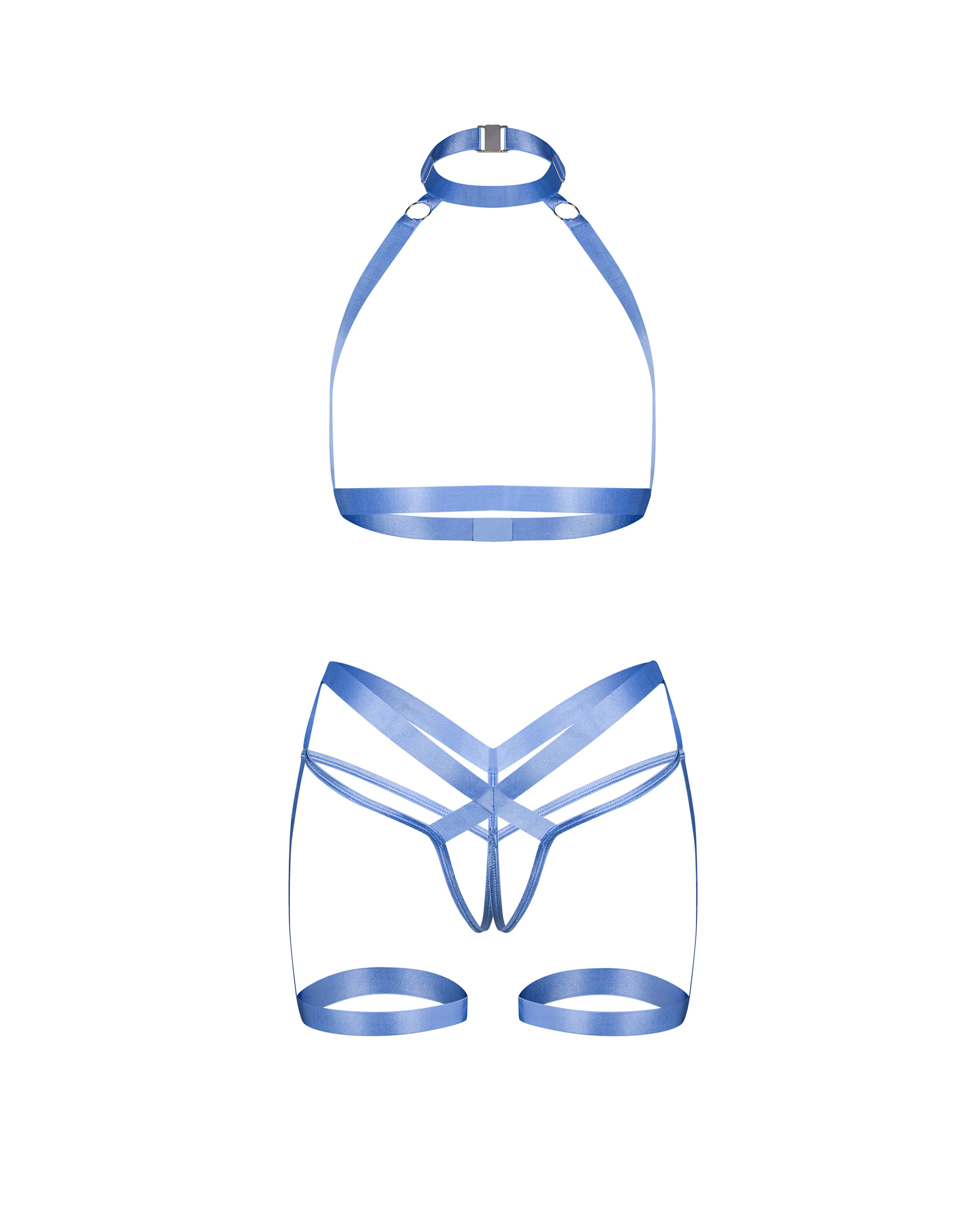 Dwuczęściowy, błękitny komplet harness wykonany z elastycznych materiałów premium. Pasy w błękitnym kolorze tworzą top, choker oraz podwiązki połączone ze stringami o otwartym fasonie. Posiada regulację na szyi oraz zapinane haftki na plecach.