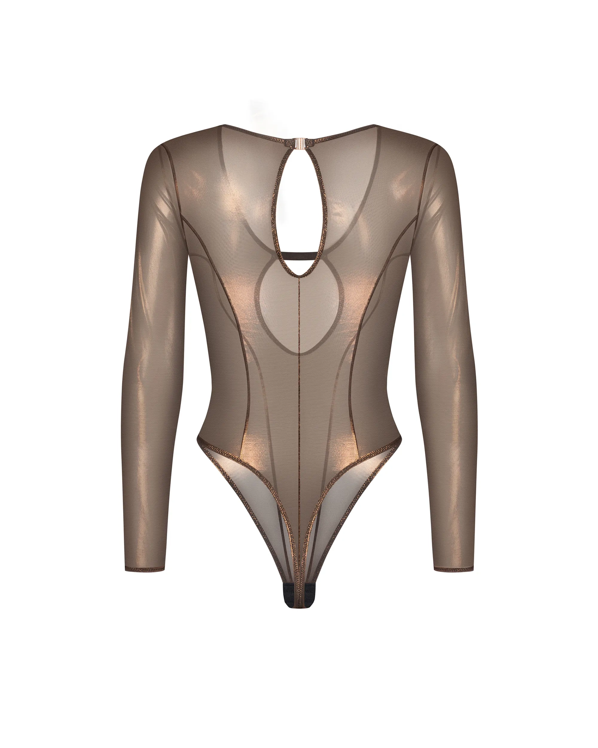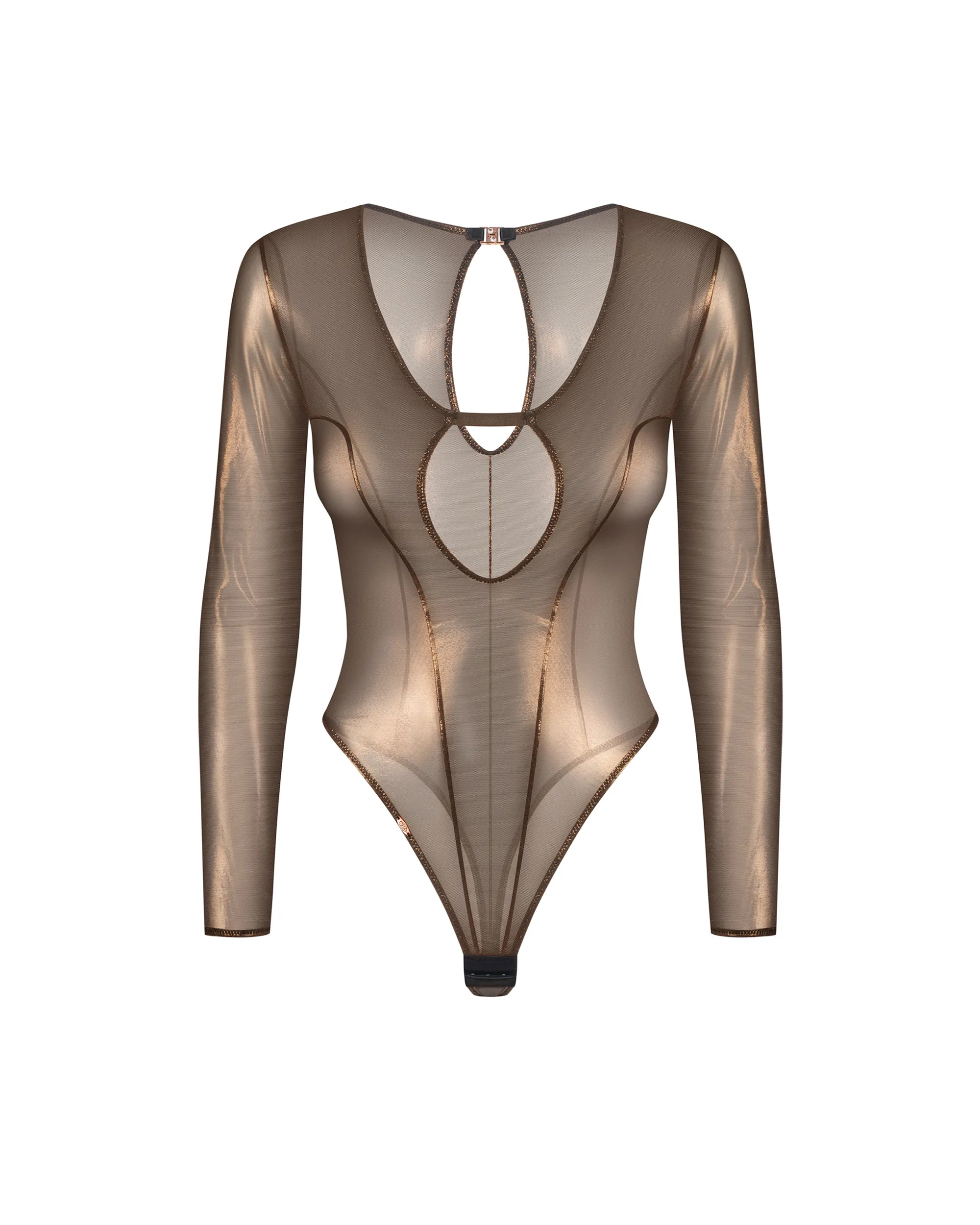 Elegancja i zmysłowość w jednej odsłonie – to body zachwyca subtelną, połyskującą złotem siateczką, która otula ciało niczym druga skóra. Długie rękawy nadają mu wyrafinowanego charakteru, a prześwitujący materiał uwodzi i intryguje, odsłaniając dokładnie tyle, ile trzeba. Idealne zarówno do śmiałych stylizacji na wyjątkowe okazje, jak i do intymnych chwil, gdy chcesz oczarować i zaskoczyć.