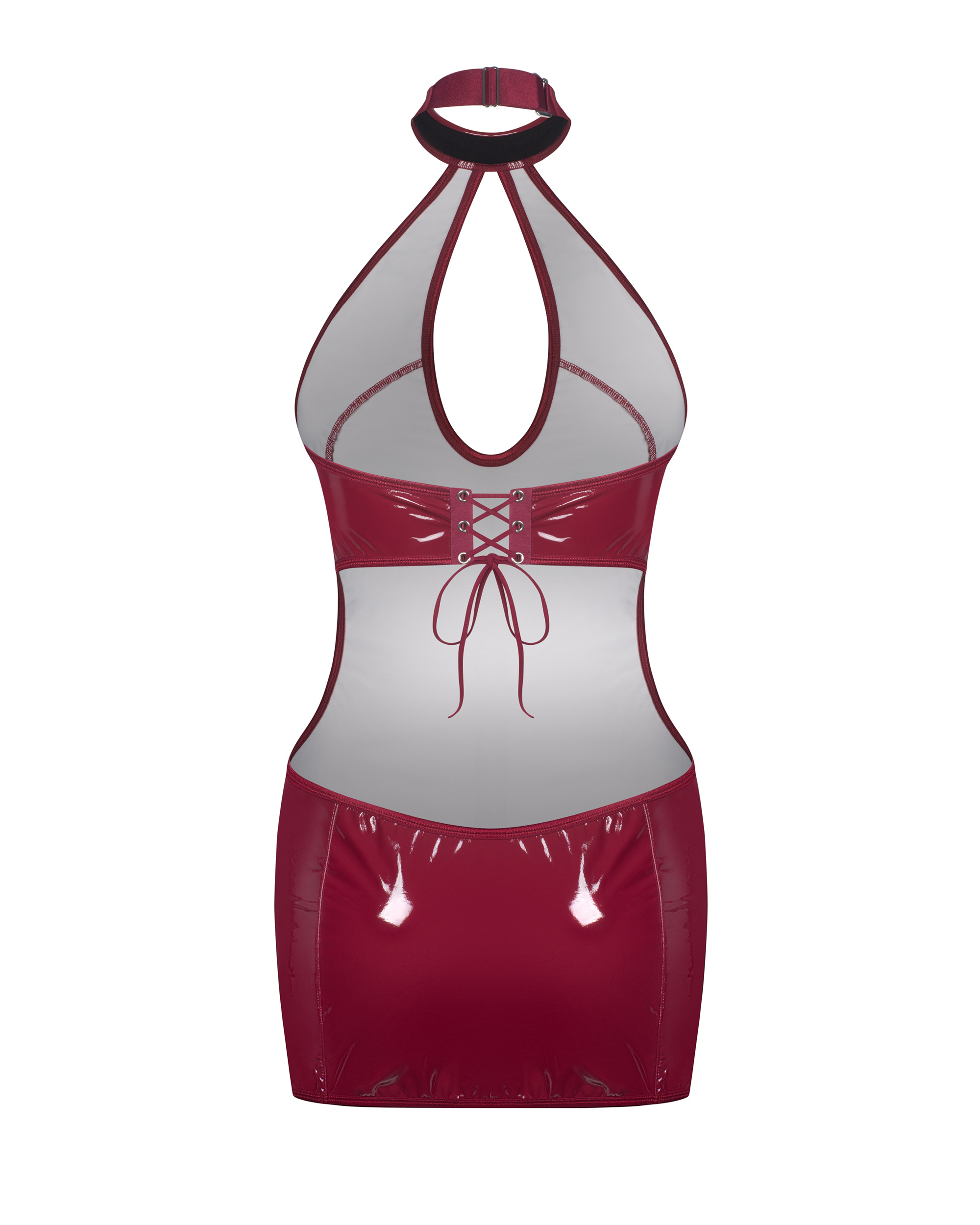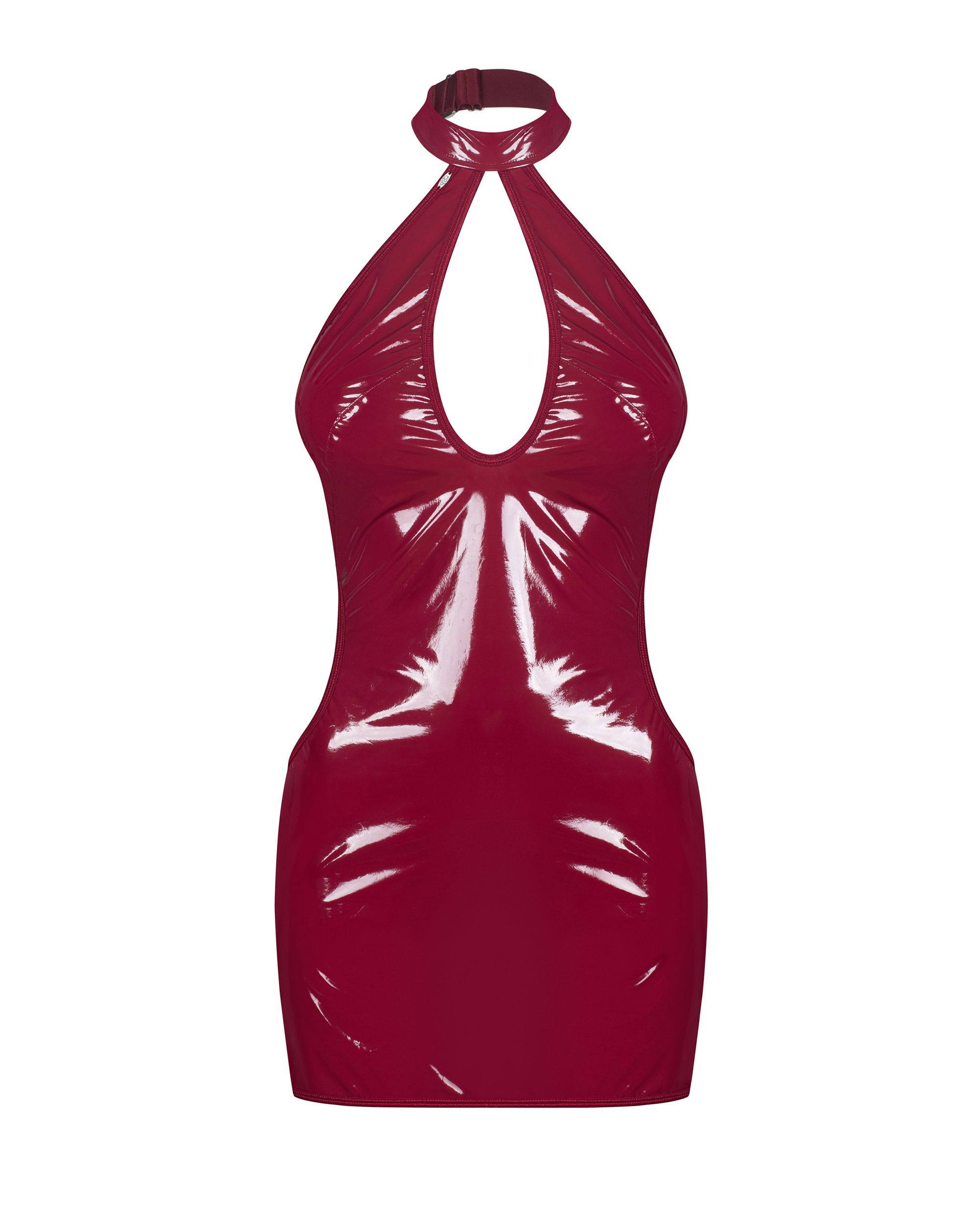 Sukienka zachwycająca połyskiem i perfekcyjnym dopasowaniem. Jej lakierowana powierzchnia pięknie odbija światło, tworząc efekt drugiej skóry. Zmysłowe wycięcie na dekolcie subtelnie eksponuje kształty, a wiązanie z tyłu dodaje całości charakteru i umożliwia idealne dopasowanie. Choker z zapięciem na szyi wprowadza nutę dominacji, a gładka linia bioder podkreśla sylwetkę w sposób wyrafinowany i zarazem odważnym.