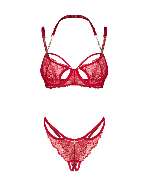 Czerwony komplet zdobiony złotymi łańcuszkami