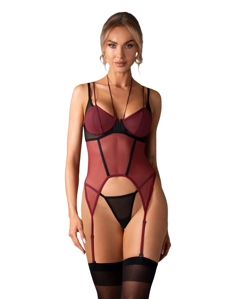 Bordowy gorset z podwójnymi ramiączkami i stringi