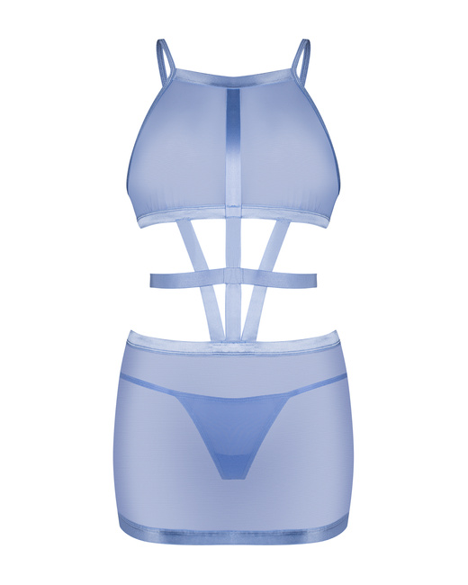 Niebieska, prześwitująca sukienka i stringi