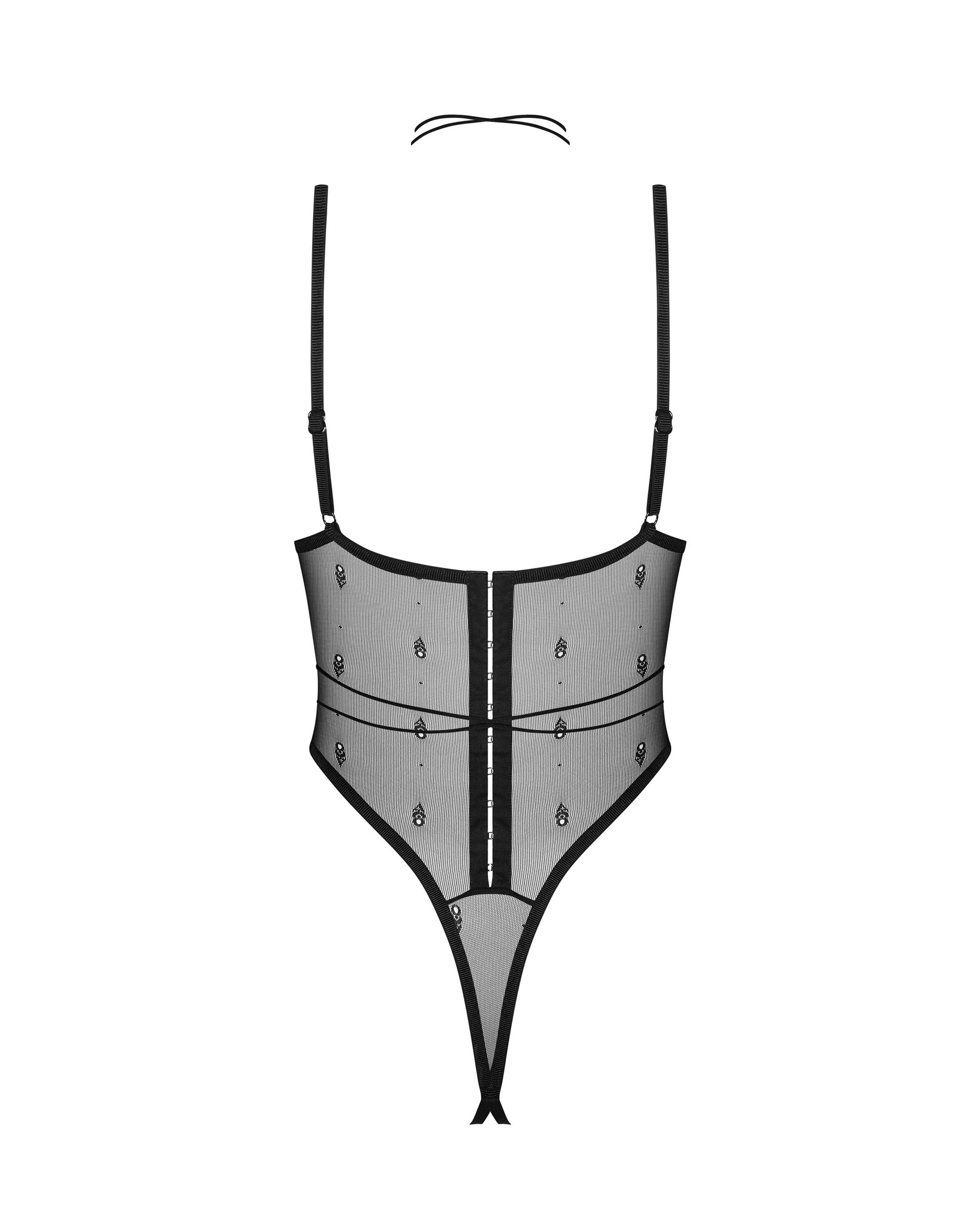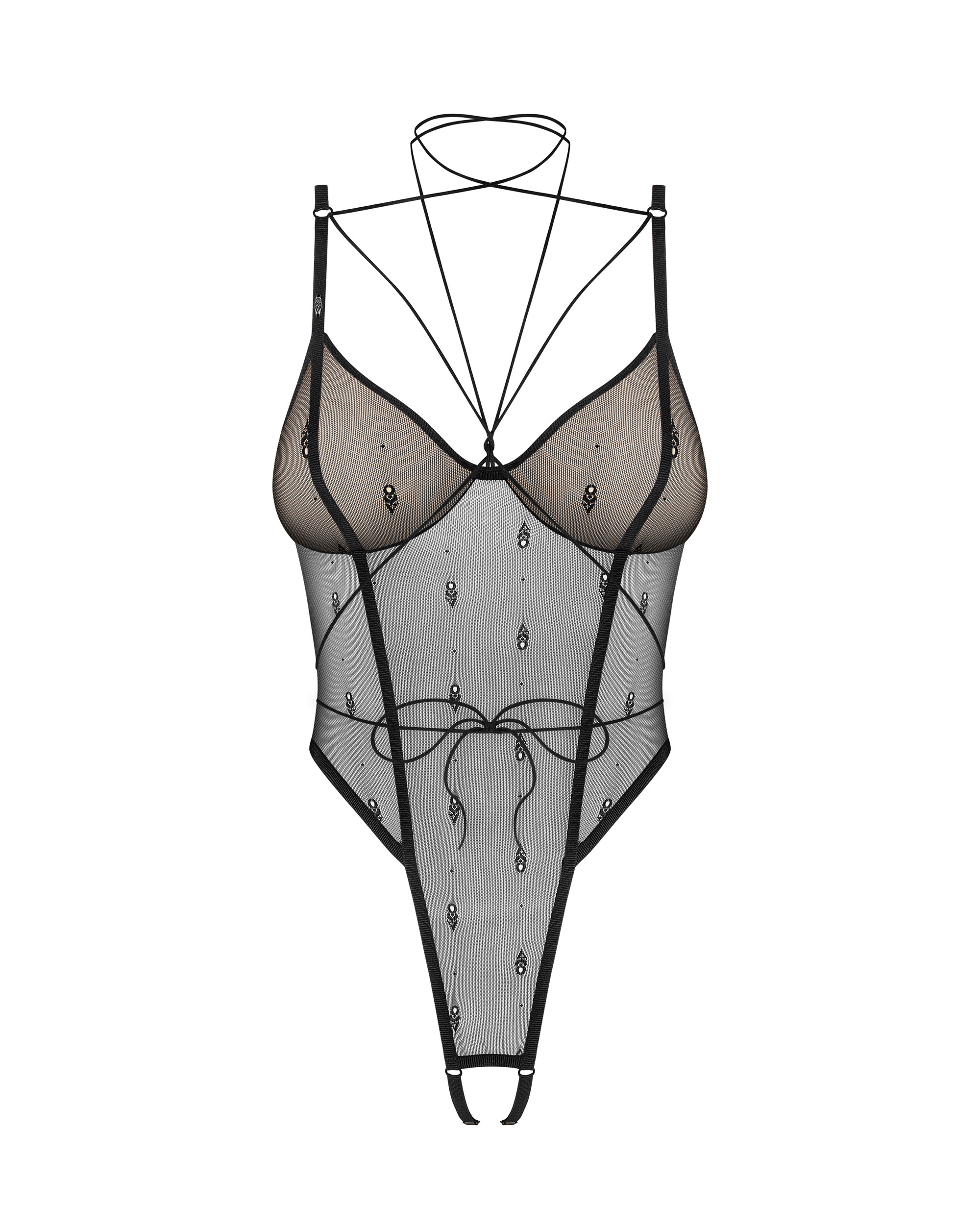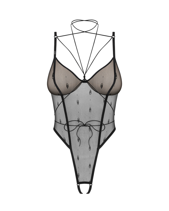 Otwarte, wysoko wycięte body z fiszbinami eksponuje biodra i pośladki. Delikatne, elastyczne gumki tworzące choker na szyi umożliwiają wiązanie w różnych kombinacjach. Zapięcie na haftki na plecach, regulacja ramiączek oraz pasków w kroku. Produkt wykonany z przeźroczystego meshu ozdobionego żakardowym sygnetem marki. Prążkowane wykończenie. Dodatki i logo marki w czarnym kolorze.