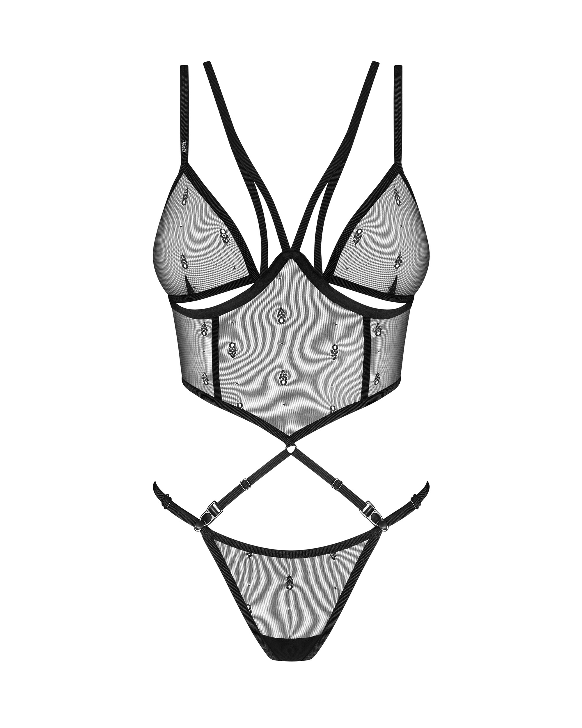 Nowoczesny, czarny komplet: top z miękkimi, częściowo wyciętymi miseczkami oraz przeźroczyste stringi. Pojedyncza fiszbina, regulawane zapięcie na haftki, podwójne ramiączka w biustonoszu. Regulowane paski w stringach oraz topie dbają o wygodę i dopasowanie. Projekt wykonany z delikatnych materiałów: transparentnego meshu z żakardowymi sygnetami marki oraz prążkowanych lamówek. Dodatki oraz logo marki w kolorze czarnym.