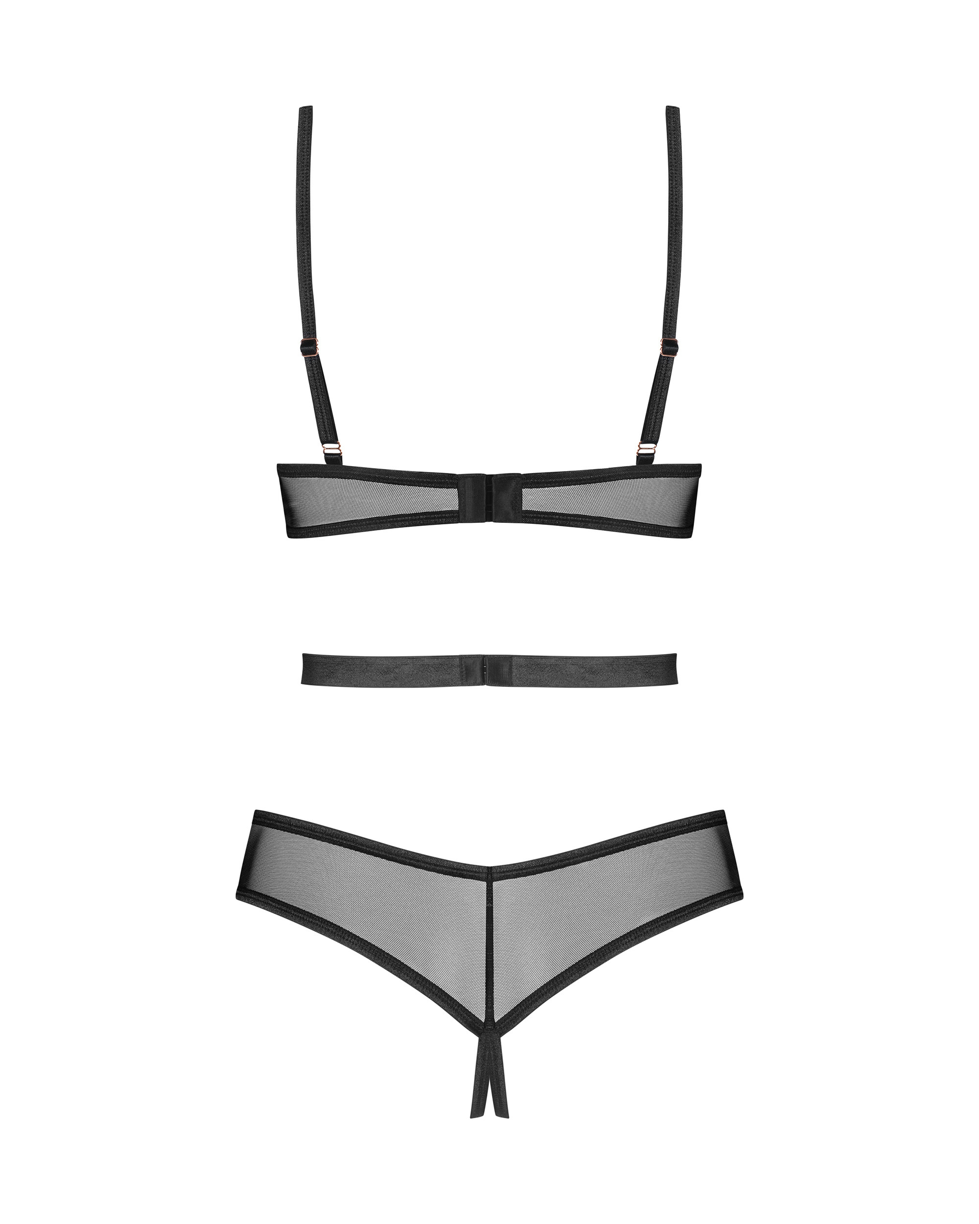 Czarne otwarte body z nowoczesną konstrukcją wykonane z elastycznych materiałów premium. Liczne regulacje dbają o idealne dopasowanie do ciała. Delikatne metalowe dodatki w kolorze rose gold kontrastują z czernią.