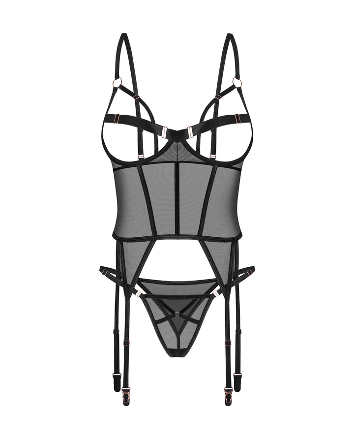 Czarny gorset o nowoczesnym kroju wykonany z miękkiego i elastycznej siateczki zapewnia komfort noszenia. Regulowane paski i zapięcie z tyłu dbają o idealne dopasowanie do sylwetki. Subtelne metalowe dodatki w kolorze rose gold dopełniają całości. W komplecie ze stringami z regulowaną talią.