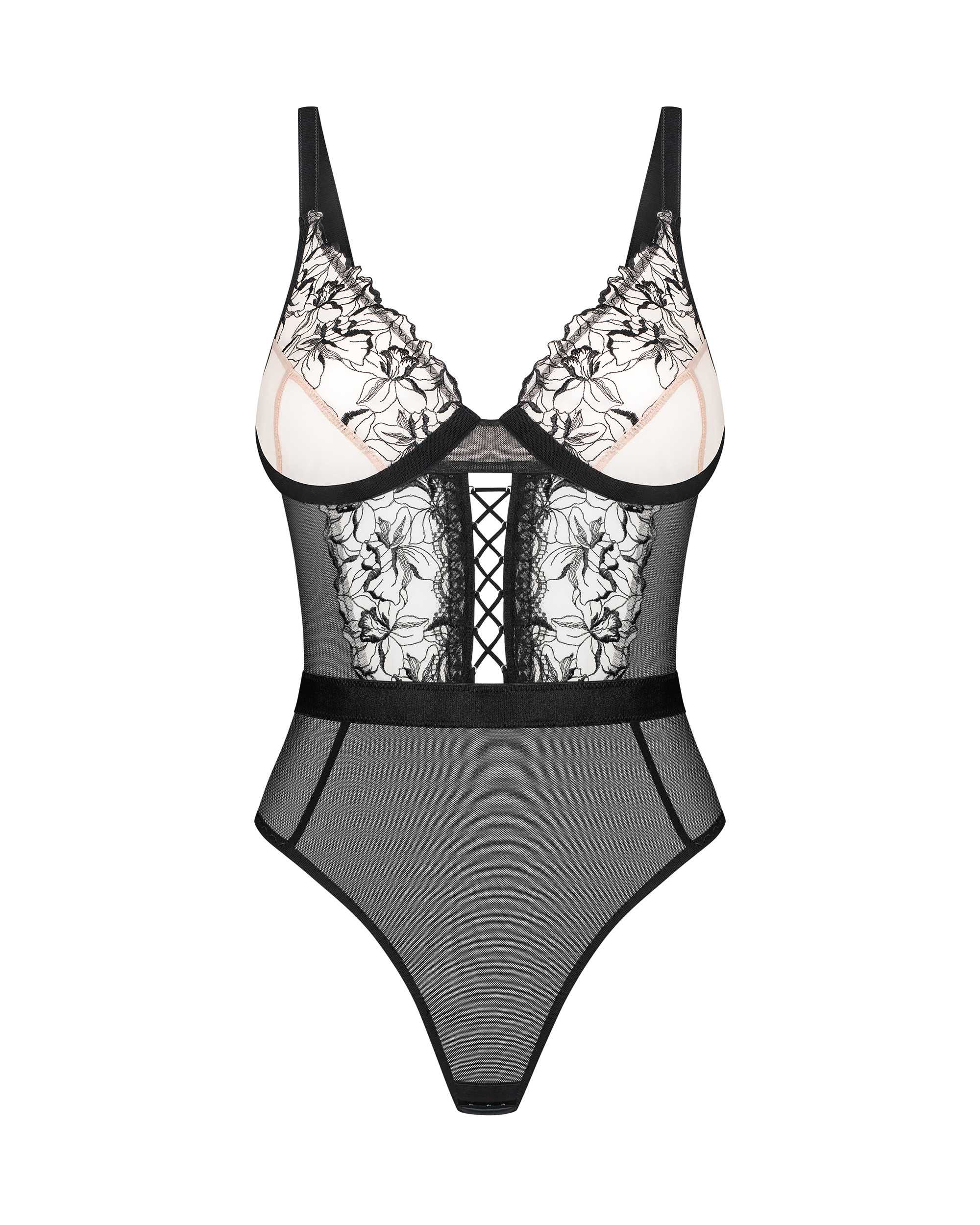 Body z fiszbinami i sznurowaniem z przodu. Wysoko wycięte na linii bioder. Pasek w tali, wycięcie na plecach. Regulacje, dzięki którym dopasujesz produkt do sylwetki. Uszyte z transparentnej, elastycznej siateczki. Tiulowe miseczki ozdobione kwiatowym haftem.