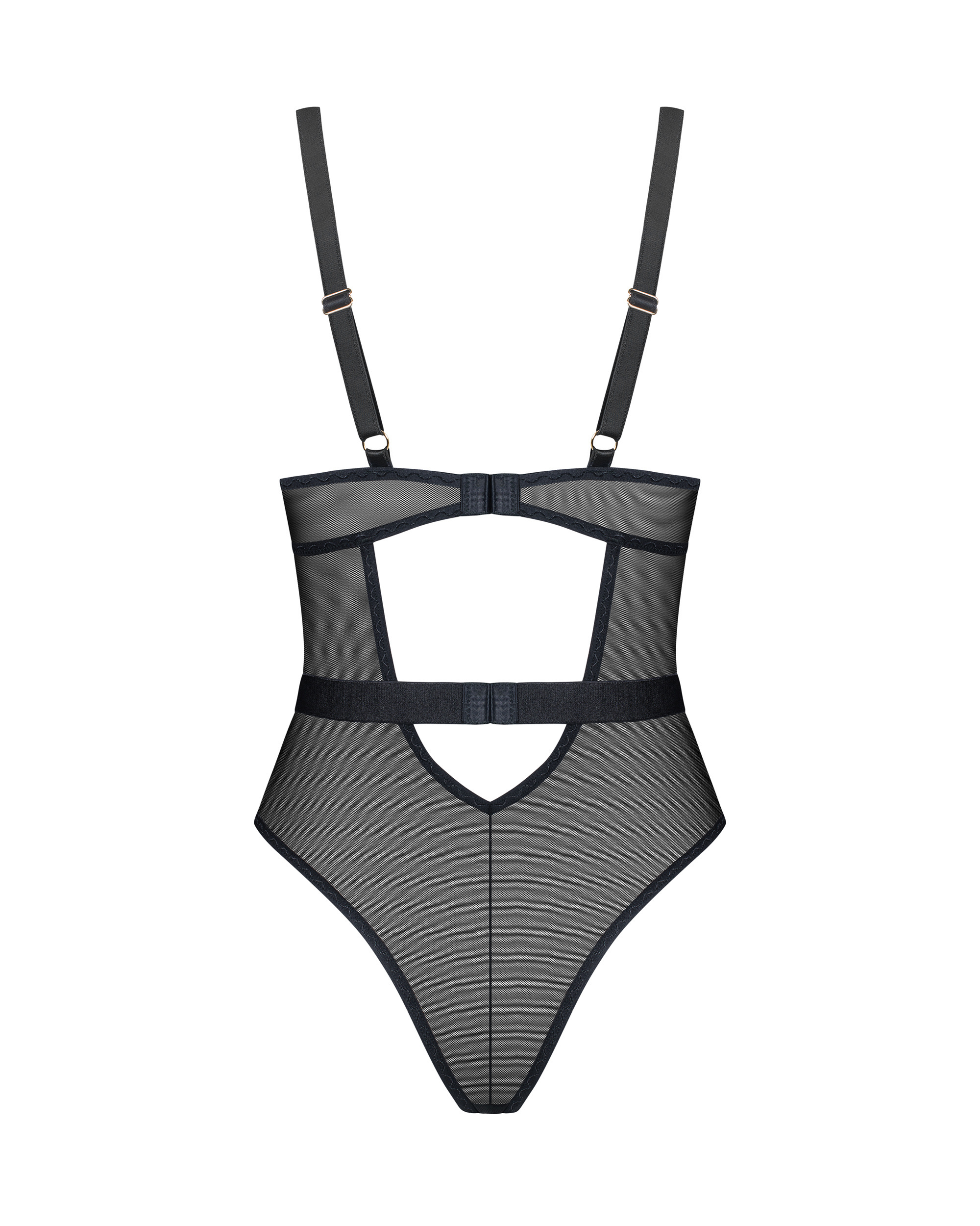Eleganckie, czarne body z wycięciem na plecach to wyrafinowany projekt podkreślający piękno kobiecej sylwetki. Zaprojektowane w UE.