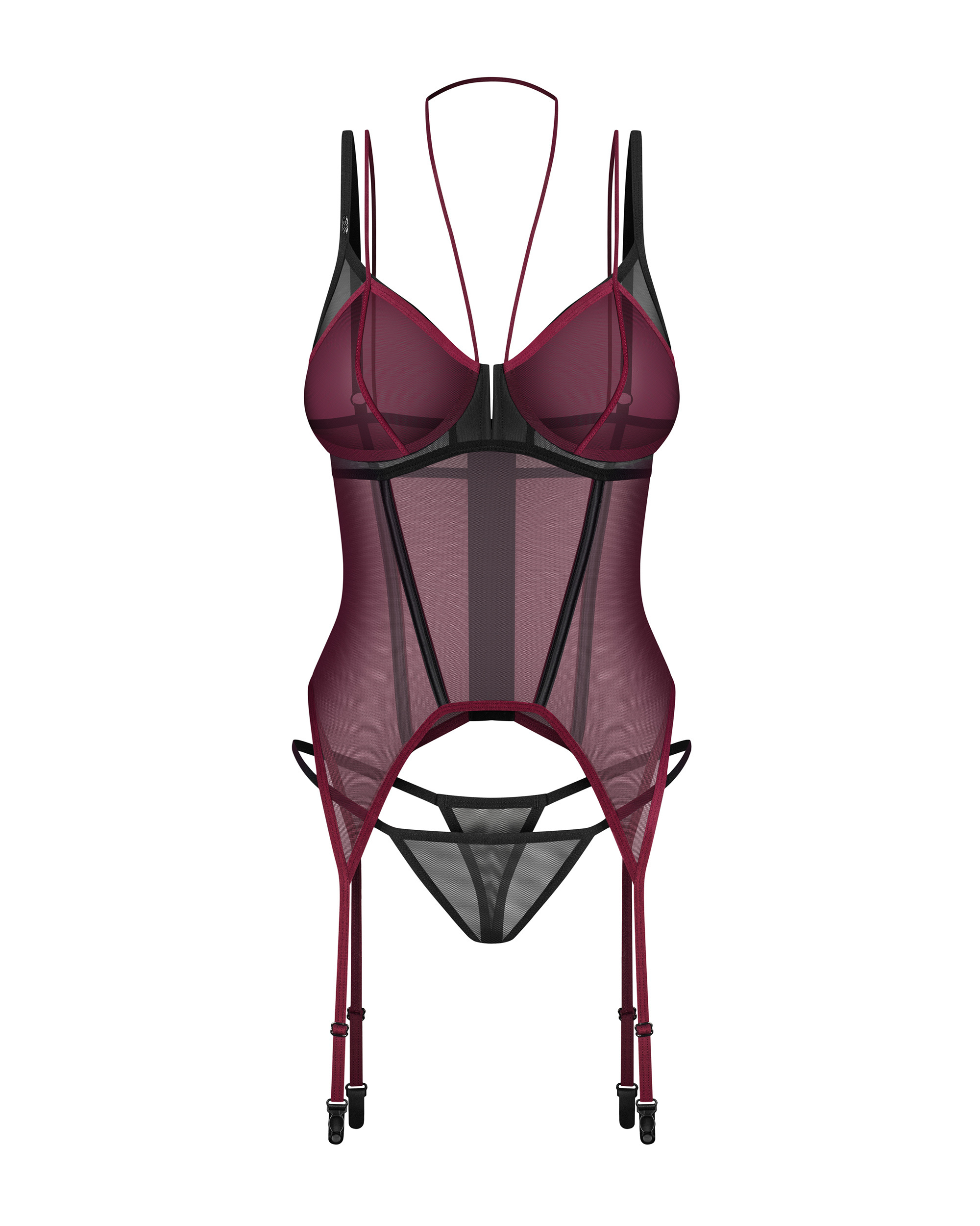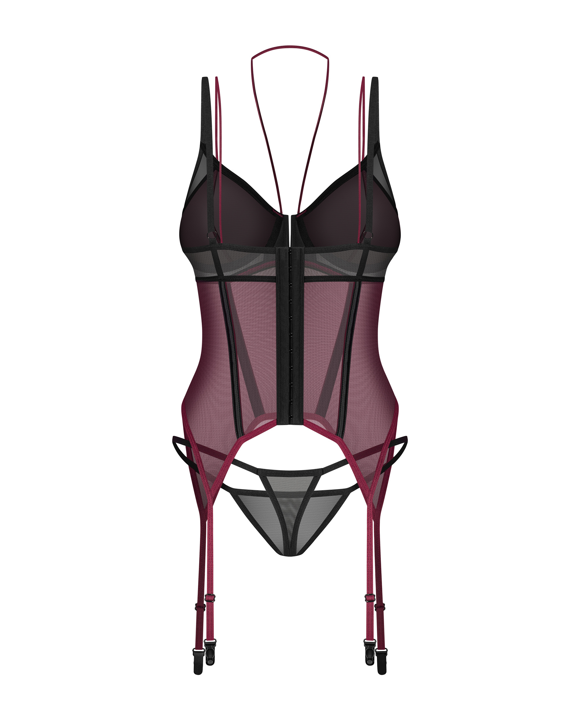Gorset wykonany z bordowego, półprzezroczystego materiału, który idealnie kontrastuje z czarnymi akcentami. Tkanina jest delikatnie prześwitująca, co dodaje całości zmysłowego charakteru. Pionowe przeszycia i wstawki wzdłuż gorsetu dodatkowo modelują sylwetkę, tworząc efekt optycznego wyszczuplenia. Wysokiej jakości tkaniny zapewniają komfort i doskonałe dopasowanie. Gorset jest także wyposażony w integralne paski do pończoch, co pozwala na stworzenie kompletnej stylizacji z dodatkowymi elementami bielizny.