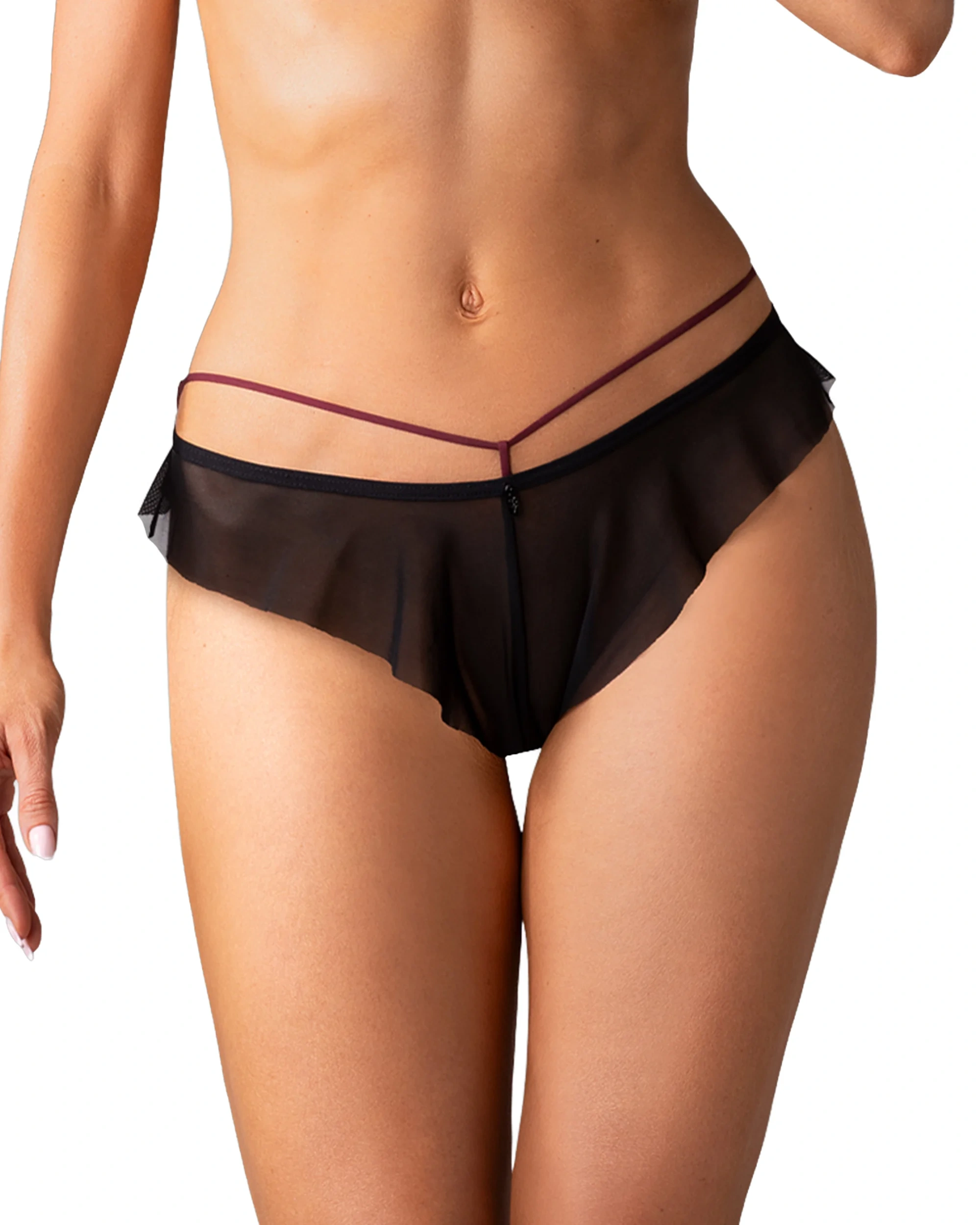 Figi Parisel o kroju układającym się w literę „V”. Fason charakteryzuje się wyciętymi pośladkami. Luksusowy, bordowy mesh ozdabiają elastyczne paski na linii bioder. Bielizna wykończona falbanką.